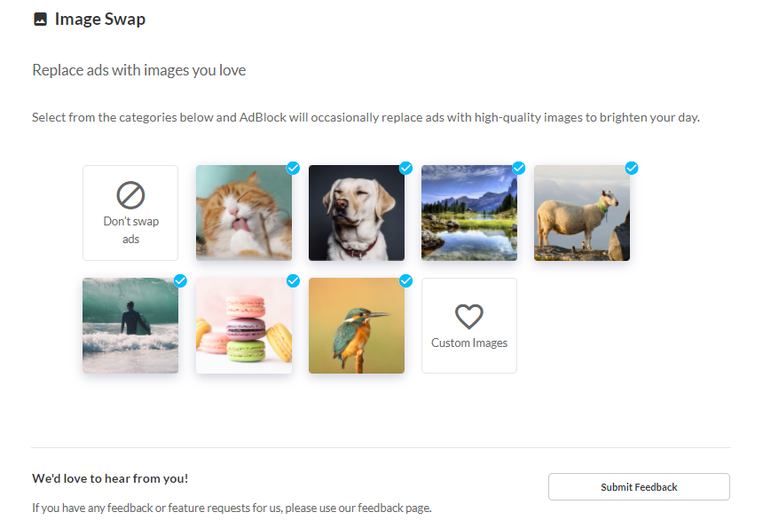 You can change the image categories used in AdBlock Premium's Image Swap feature via the Options page. Open your AdBlock menu in the upper right-hand corner of your browser, and select the gear icon. Under Premium, select Image Swap. You can choose between cats, dogs, landscapes, goats, oceans, food, birds, or your own custom image collection.