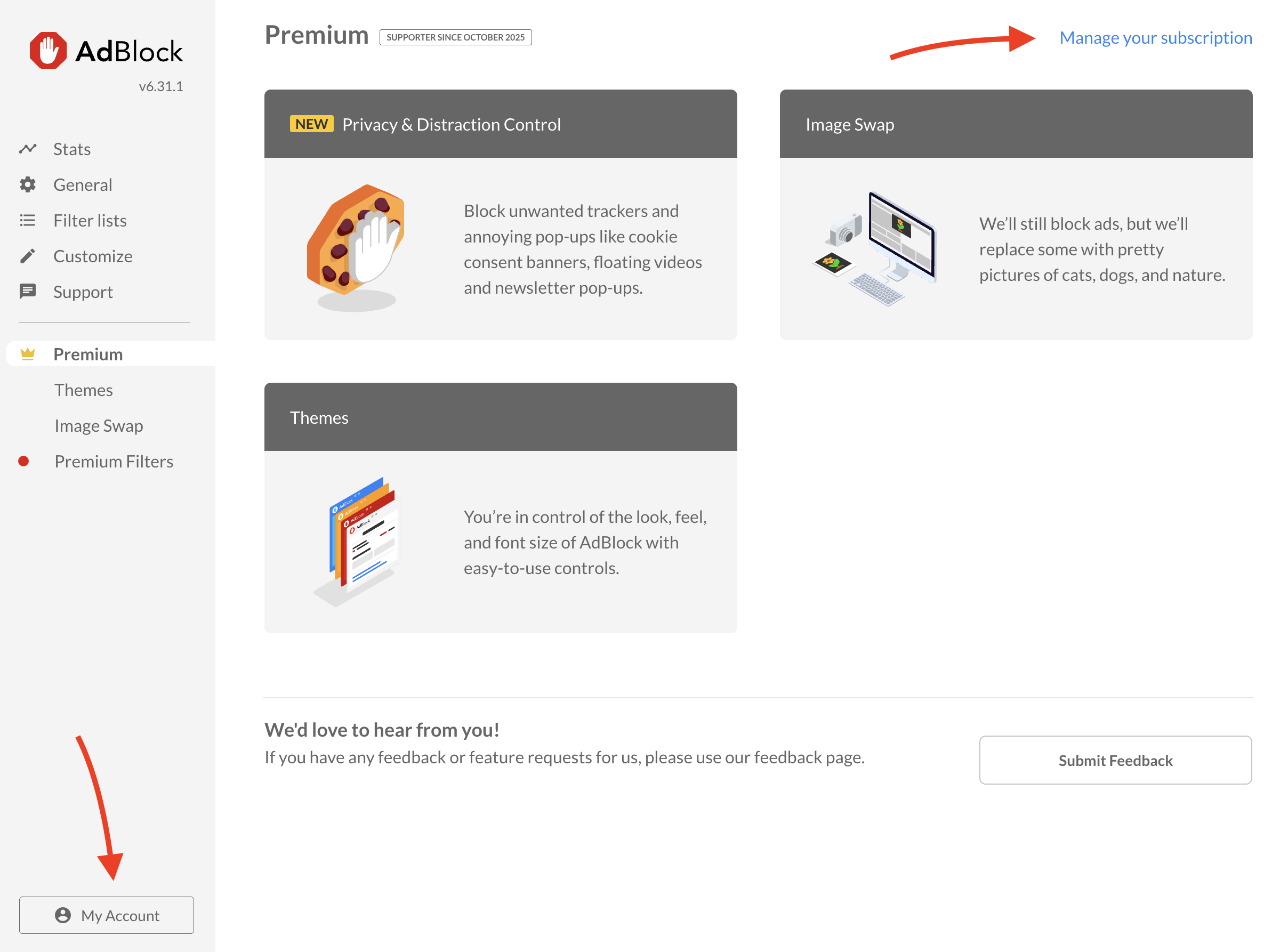 3. In AdBlock's Options, go to the Premium tab and then click on Manage your subscription or My Account.